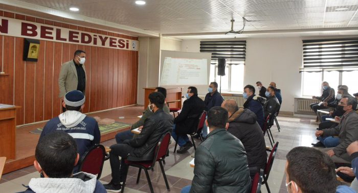 İş sağlığı ve güvenliği yasası gereğince Sorgun Belediyesi’nde görevli personele belediye toplantı salonunda, iş güvenliği uzmanı tarafından ilkyardım eğitimi veriliyor.