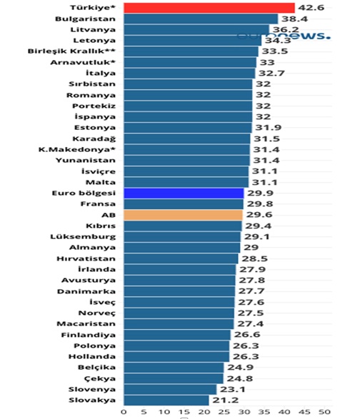 AB İstatistik Ofisi Eurostat verilerine göre 2022 yılında AB’de Gini katsayısı 29,6 oldu. Türkiye’nin ise Gini katsayısı 42,6. (Gini katsayısının büyümesi, gelir dağılımının bozulduğunu gösterir.) Türkiye bu değerle Avrupa’da 36 ülke içinde gelir dağılımı en bozuk ülkedir.