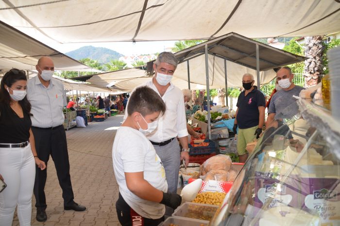 Semt pazarı ve esnafı gezen Marmaris Belediye Başkanı Mehmet Oktay, “Maske, mesafe ve hijyen kurallarına uyduğumuz sürece tehlike de azalacaktır” diyerek pandemi kurallarını hatırlatmaya devam ediyor.