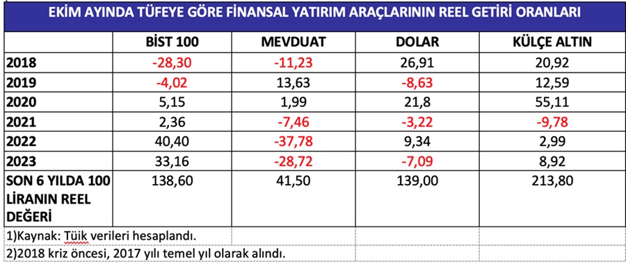 Finansal yatırım araçlarının açıklanan Ekim 2023 yıllık reel getiri oranları şöyledir;