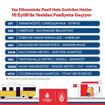 İBB’ye bağlı hizmet veren toplu ulaşım araçlarından otobüs, metro ve vapurlarda yaz tarifesi sona eriyor, ‘Kış Tarifesi’ uygulanmaya başlıyor. Yeni sefer düzenlemesine uygun tarife İETT Otobüslerinde 10 Eylül Cumartesi günü başladı. Metro İstanbul’a bağlı raylı sistemler 12 Eylül Pazartesi, Şehir Hatları’na bağlı olarak hizmet veren vapurlar ise 19 Eylül Pazartesi günü itibarıyla artık ‘Kış Tarifesi’ uygulayacak.