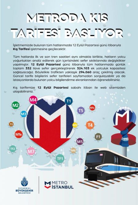 Metro İstanbul AŞ de 12 Eylül 2022-Pazartesi günü itibarıyla tüm hatlarda ‘Kış Tarifesi’ne geçiyor. Güncel tarifeye, 12 Eylül Pazartesi sabahı itibarı ile www.metro.istanbul/ web sitesinden, mobil uygulamalarından ve istasyonlarda bulunan info panolardan ulaşabilirsiniz.