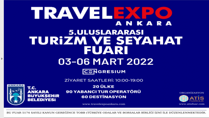 Turizm sektörüne yön veren sektör temsilcilerinin en önemli buluşma noktası olan ve ATİS Fuarcılık tarafından 2016 yılından itibaren aralıksız olarak 4 kez düzenlenen TRAVELEXPO ANKARA Fuarı, 3-6 Mart 2022 tarihlerinde ATO Congresium Fuar ve Kongre Merkezi’nde; Atrium, Truva, Zelve hollerinde düzenlenecek.