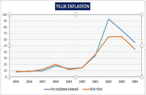 Yıllık enflasyon oranı olarak ,2018 yılına kadar TÜFE İTO geçinme endeksinden daha yüksek, 2019 ‘dan beri TÜFE İTO geçinme endeksinden daha düşük çıkıyor. (Aşağıdaki Grafik)