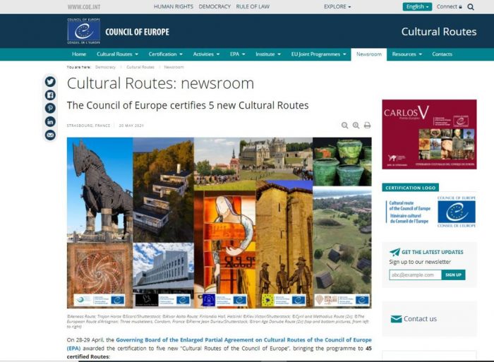 Avrupa Konseyi uluslararası anlaşmalar ve şartlarına göre hazırlanan başvuru dosyasında projede bulunan Yunanistan, Tunus, Arnavutluk ve İtalya’nın belediye ve yerel kurumları ile yapılan verimli işbirliği sonucunda Avrupa Konseyi’nin tesciline hak kazandı.