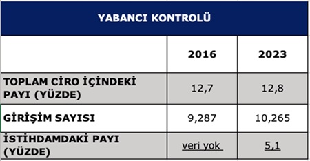 2023 yılında yabancı kontrolündeki girişimlerin toplam ciro içindeki payı yüzde 12,8’dir. Buna karşılık aynı işletmelerde çalışanların payı yüzde 5,1 dir. Bu demektir ki yabancı sermayeli girişimler istihdam yaratmıyor. Dahası uzman ve vasıflı işgücünü dışarıdan getiriyor.