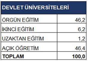 Aslında üniversite eğitimi, kitabi bilgilerle sınıf geçmek değildir. Üniversite eğitimi süreklilik ister. Üniversite içinde öğrencinin birebir öğretim üyesi ile çalışması gerekir. Üniversite içinde tartışmalara katılması gerekir. Böylece öğrencinin analiz ve sentez yeteneği gelişecektir. Maalesef Türkiye’de örgün eğitim oranı yüzde 46’dır. Diğerleri açık öğretim, ikinci öğretim ve uzaktan eğitimdir. (Aşağıdaki tablo)