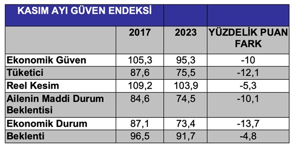 Hükümetin resmi verilerde yer alan; bu dediklerimden haberi bile olduğunu sanmıyorum. Bunun içindir ki, aşağıdaki tabloda görüldüğü gibi; artık toplumda güven sorunu oluştu. 2017 sonrasında Üreticinin ve tüketicinin sisteme olan güveni düştü, ailenin maddi durumu bozuldu, ekonomik durum bozuldu ve halkın umudu da kalmadı.