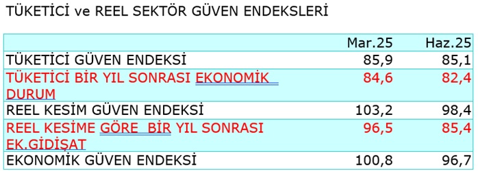 - Reel kesim güven endeksi, geçen sene Haziran ayında güven sınırı üstünde 103,2 iken bu sene Haziran ayında güven sınırı altına düştü 98,4’e geriledi.