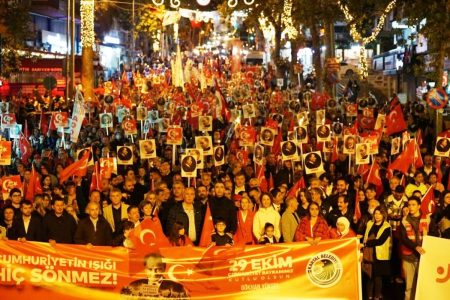 Akşam saatlerinde ise Kuvayı Milliye Kahramanı Kartallı Kazım’ın adının verildiği meydanda toplanan binlerce kişi, Kartal Meydanı’nda bulunan Atatürk Anıtı’na doğru yürüyüşe geçti. Ellerinde Türk Bayrakları, Atatürk resimleri ve meşalelerle kortej oluşturan vatandaşlar, marşlar eşliğinde Cumhuriyet Bayramı coşkusunu yaşadı.