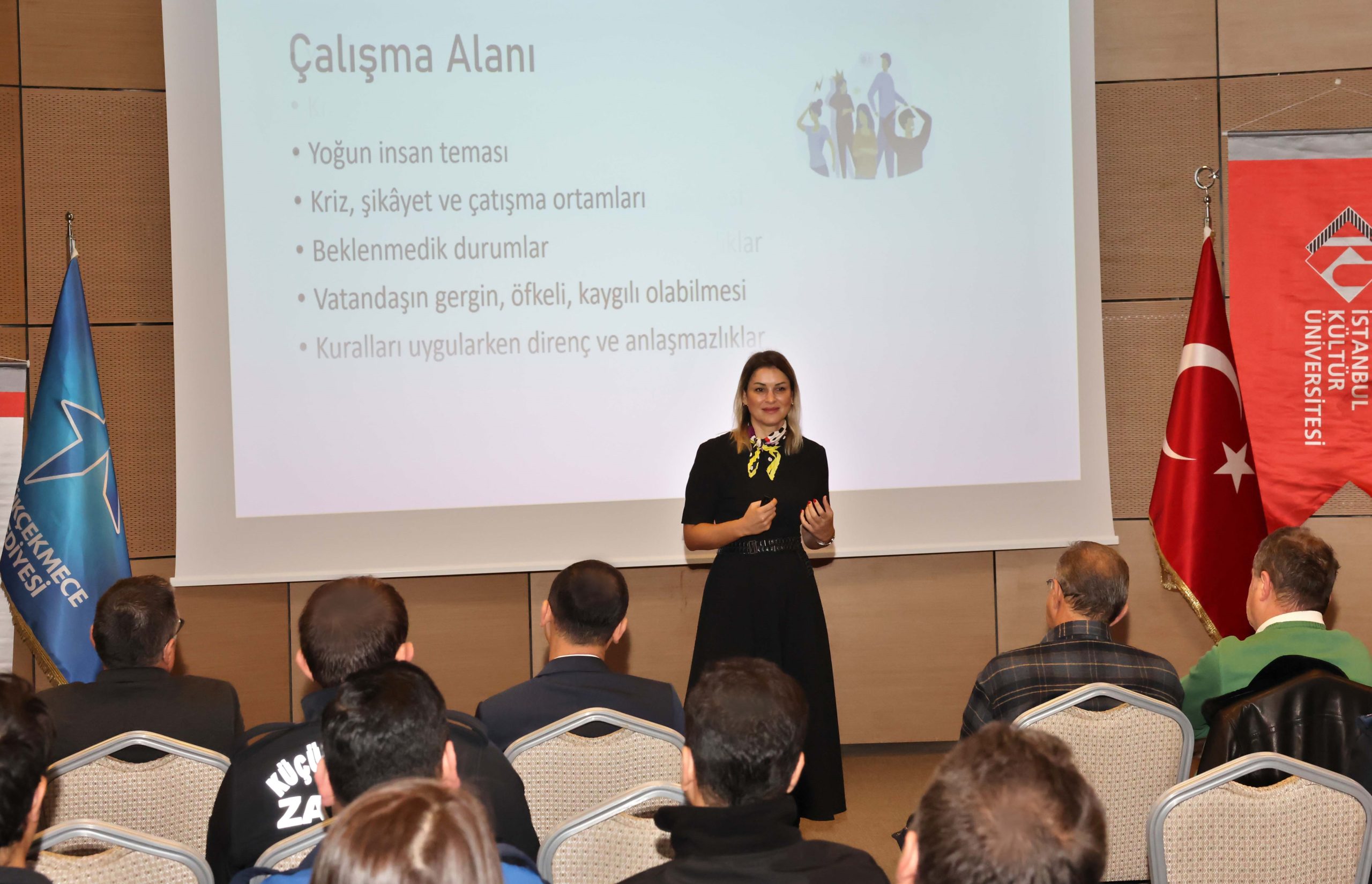 İnsan Kaynakları ve Eğitim Müdürlüğü tarafından düzenlenen eğitimde; Doç. Dr. Burcu Türk ve Dr. Öğr. Üyesi Ezgi Özkan stres ve öfke yönetimi, Prof. Dr. Işıl Zeybek etkili iletişim teknikleri ve Dr. Öğr. Üyesi Serkan Seyhan hukuki yetkiler gibi konularda zabıta personeline ayrıntılı bilgi verdi.
